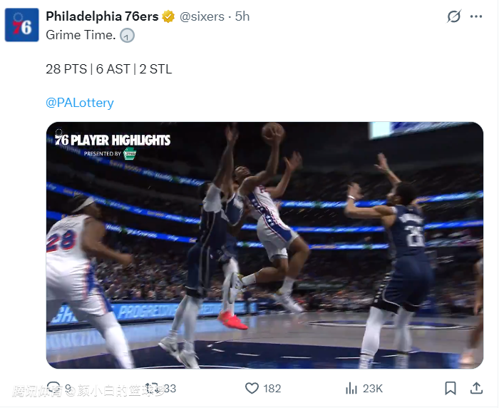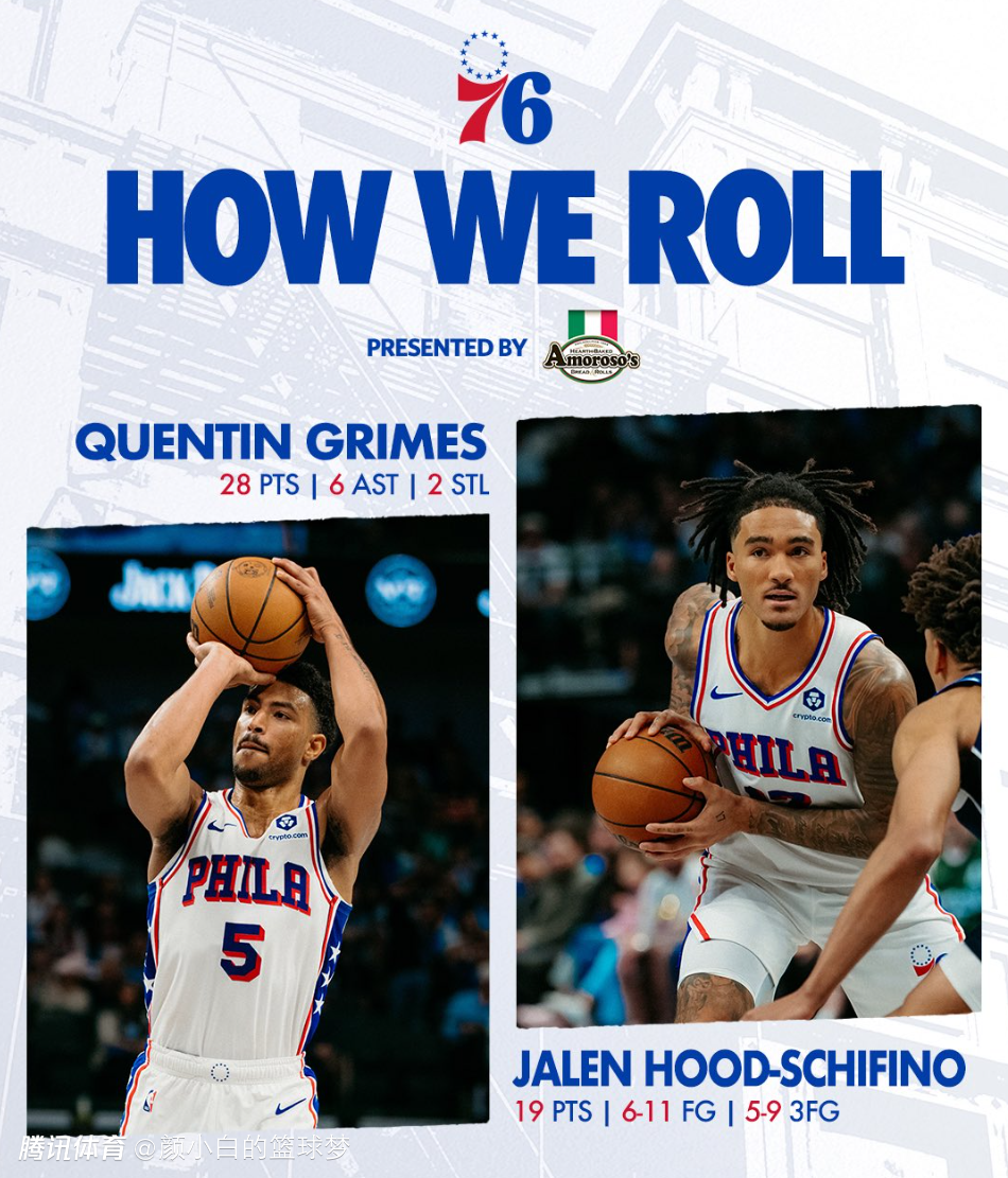 费城76人官方晒出格兰姆斯的比赛集锦写道:格兰姆斯时间,全场比赛32分钟,19中10,三分7中2,罚球9中6,拿到28分6助攻2篮板2抢断。