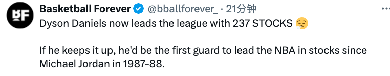 据美媒Basketball Forever报道,丹尼尔斯抢断+盖帽数总和已经来到237次,如果他继续保持这样的输出,将会成为继87-88赛季的乔丹之后,又一位在这项数据领跑全联盟的后卫。