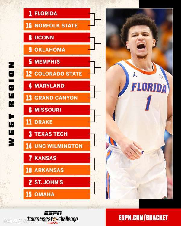 其中,东区1号种子是杜克大学,状元热门弗拉格将率队冲冠。南区1号种子是奥本大学,中西区1号种子是休斯顿大学,西区1号种子是佛罗里达大学。