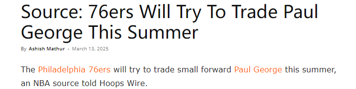此前,名记Sam Amico报道称,一位NBA消息人士透露,76人队今年夏天将尝试交易乔治。《费城问询报》的76人队记Keith Pompey报道,老鹰队和勇士队在交易截止日前有意通过交易得到乔治,但最终没有达成任何交易。勇士队最终从热火队交易得到了巴特勒。