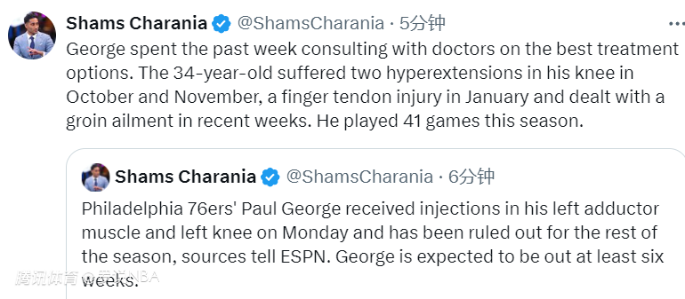 过去一周,乔治一直在与医生商讨最佳治疗方案。这位34岁的球员在10月和11月两次遭遇膝盖过度伸展损伤,1月手指肌腱受伤,最近几周又受到腹股沟伤病困扰。本赛季他共出战41场比赛。