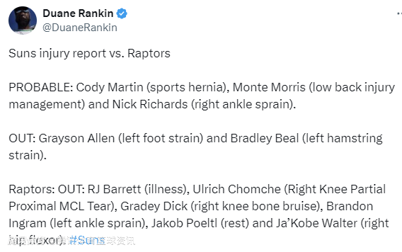 太阳队方面,格雷森-阿伦(左脚拉伤)和布拉德利-比尔(左腿筋拉伤)将缺席比赛。科迪-马丁(运动性疝气)、莫里斯(腰部受伤)和尼克-理查兹(右脚踝扭伤)大概率出战(75%的可能出战)。
