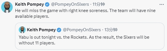 2025-03-18 07:30北京时间3月18日,NBA常规赛继续进行,76人队对阵火箭队。赛前,76人队官方宣布,亚布塞莱因为右膝酸痛缺席比赛。本场比赛,76人队仅有9名球员可用,而他们缺席比赛的人数却多达11人。