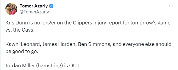 2025-03-18 09:10北京时间3月18日,根据快船队记者Tomer Azarly报道,在明日对阵骑士队的比赛中,邓恩将回归,莱昂纳德、哈登和本-西蒙斯都可以出战。具体情况如下: