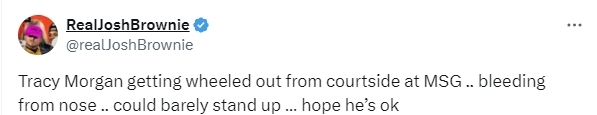 这位喜剧演员是尼克斯队的死忠球迷,当时正在场边观战,但突然呕吐,还流出了鼻血,而且几乎无法站起。在经过简单处理后,他被工作人员用轮椅推出场外。