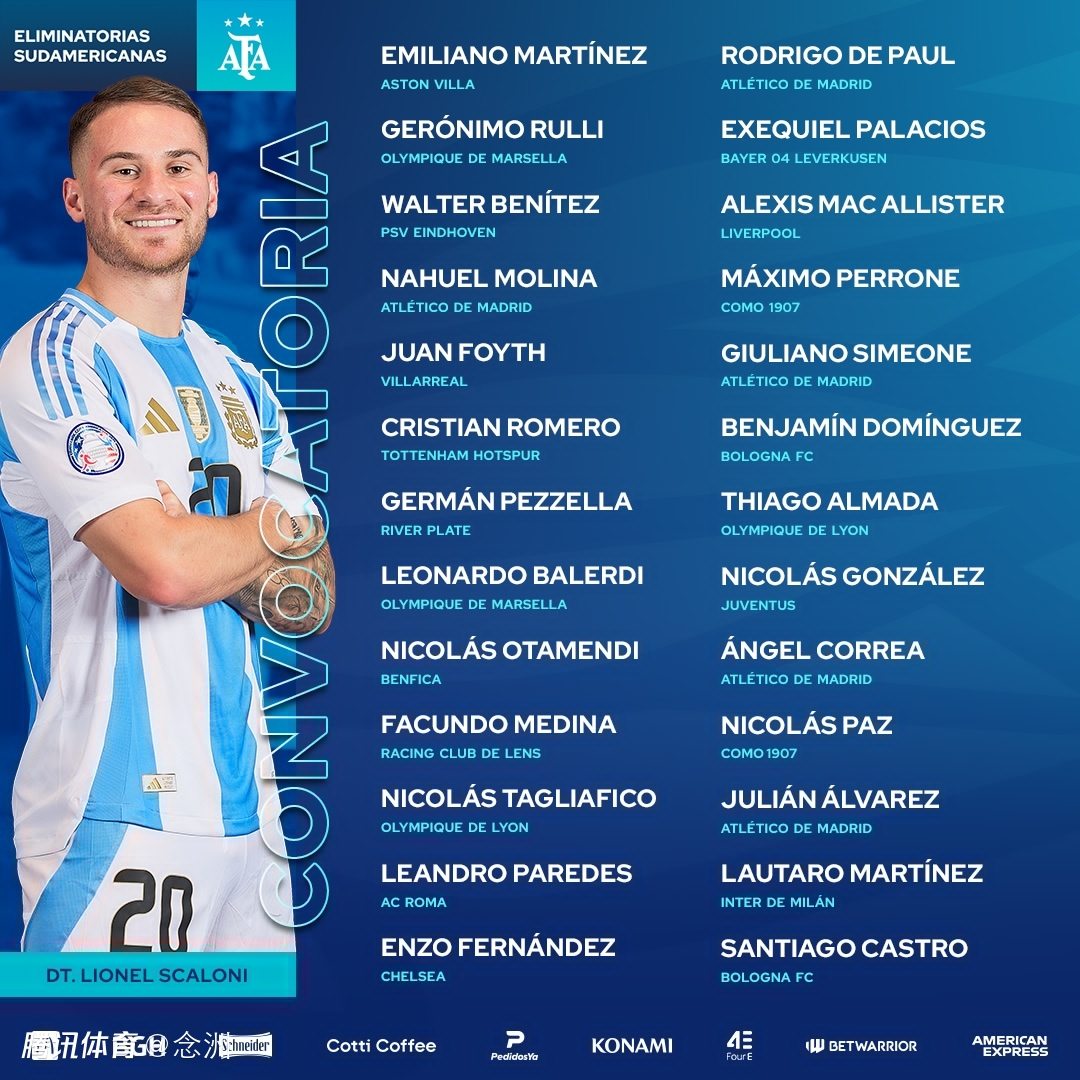 阿根廷队公布了本期国际比赛日的最终大名单,梅西、迪巴拉和蒙铁尔退出,根据阿根廷媒体报道,梅西(内收肌)和迪巴拉(屈肌)都是因伤退出。