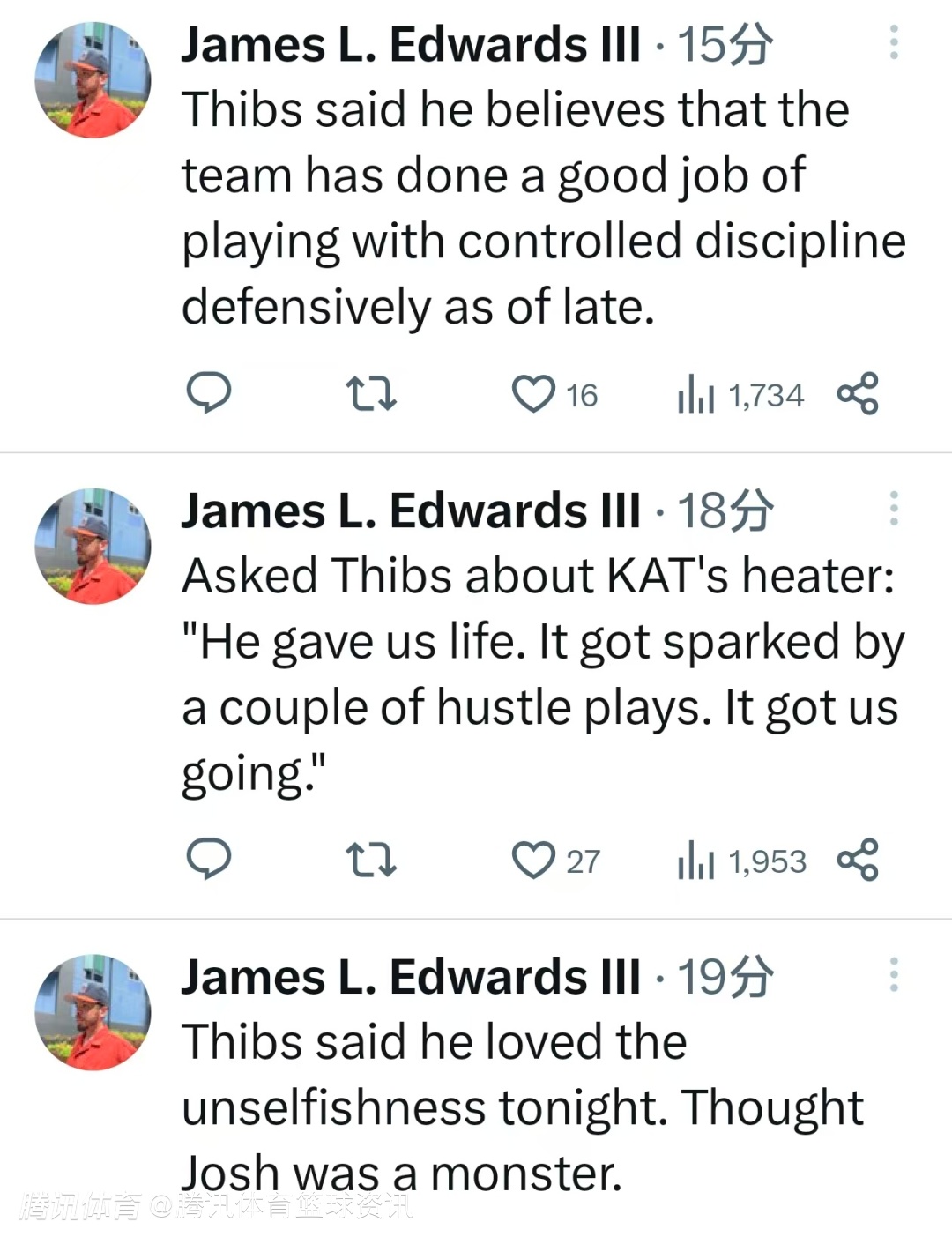 当被问及唐斯的火热手感时,锡伯杜说道:“他给我们带来了活力。这一切始于几次积极拼抢的回合,这让我们全队都动起来了。”