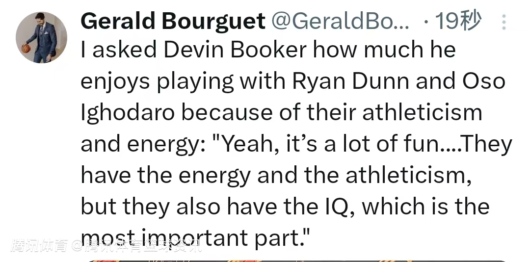谈到邓恩和伊戈达罗的运动能力和活力很棒,是否非常享受和他们一起打球,布克表示:“是的,这非常有趣。他们拥有活力和运动天赋,而且还具备球商,而这是最重要的一点。”
