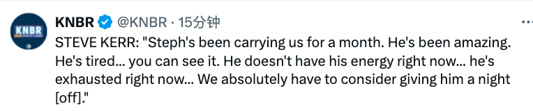 当被问及库里得到20分7助攻,却有7次失误时,科尔多次重复库里很疲惫,他不确定库里明天是否会出战对雄鹿的比赛:“库里已经带领我们一个月了,他表现得很棒,看得出来他现在很累,没有经历,我们必须要考虑让他休息一晚。”