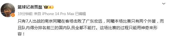 篮球记者贾磊发文:只有7人出战的南京同曦在客场击败了广东宏远,同曦本场比赛只有两个外援,而且队内得分排名前三的国内队员全都不能打。这场比赛的过程只能用神奇来形容。
