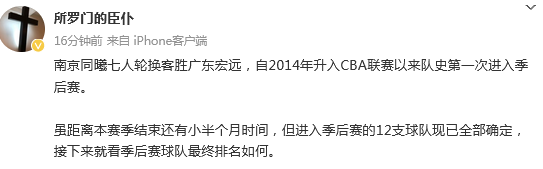 南京同曦七人轮换客胜广东宏远,自2014年升入CBA联赛以来队史第一次进入季后赛。