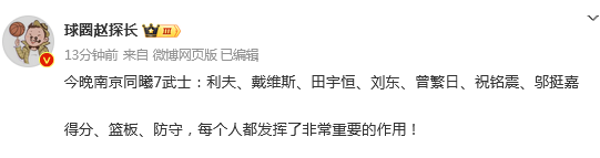 媒体人赵探长发文点评:今晚南京同曦7武士:利夫、戴维斯、田宇恒、刘东、曾繁日、祝铭震、邬挺嘉