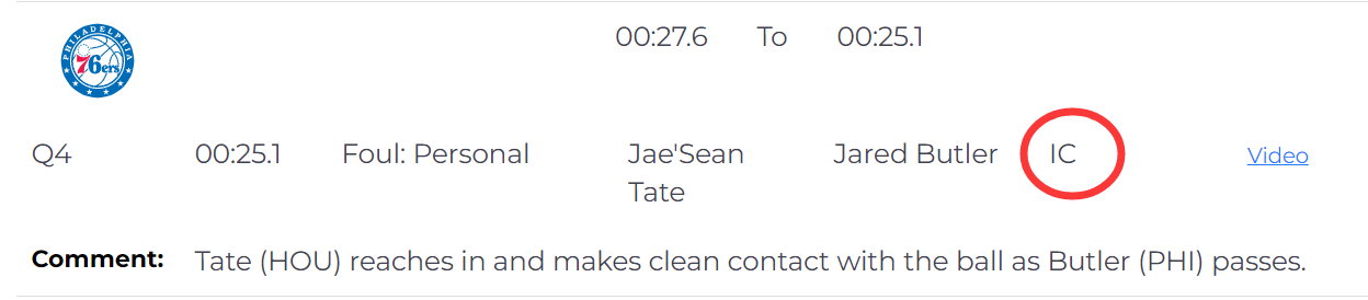 第一次错判发生在距离第四节结束还有25.1秒时,当时裁判吹罚泰特对贾里德-巴特勒犯规,裁判报告指出,贾里德-巴特勒传球时,泰特伸手并干净利落地打到了球,这是一次错判,泰特并没有犯规。这次错判,火箭吃亏,76人获利,贾里德-巴特勒得到了两次罚球机会,两罚两中。