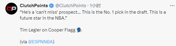 2025-03-19 07:50北京时间3月19日,NBA分析师Tim Legler在节目中谈到了今年选秀大会的状元热门库珀-弗拉格,并直言弗拉格肯定会成为NBA未来的球星。