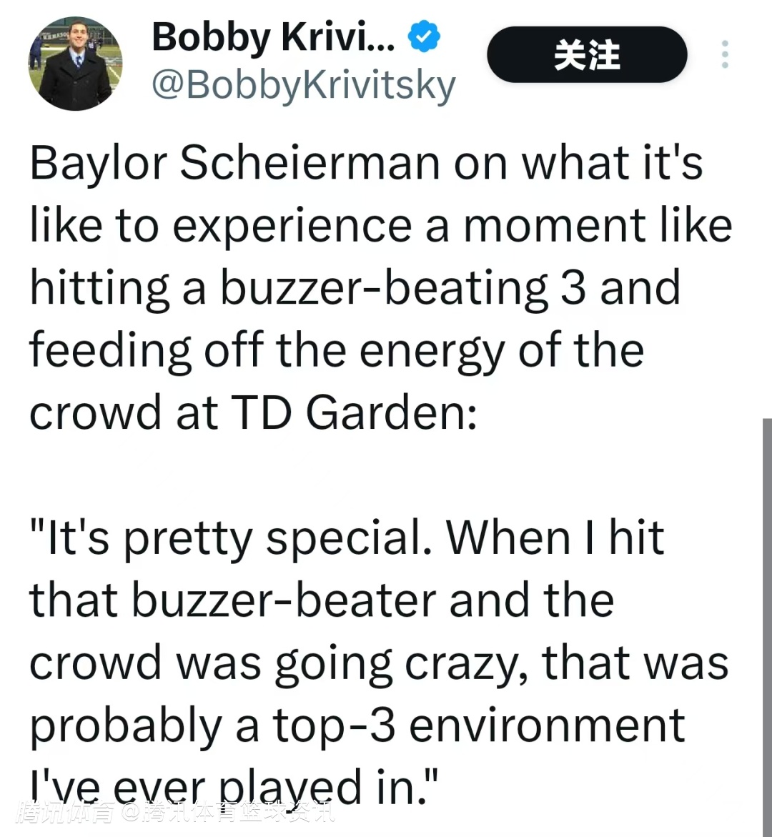 沙伊尔曼谈到在TD花园球馆命中压哨三分并感受现场球迷的热烈氛围是怎样一种体验时说道:“这种感觉特别奇妙。当我投进那个压哨三分,全场观众都沸腾了,那可能是我职业生涯中所经历过的氛围最热烈的前三名的比赛现场。”