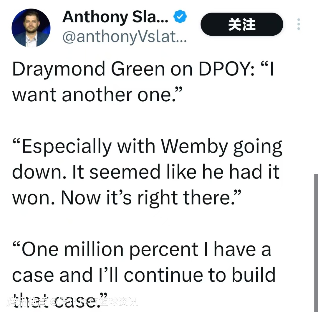 格林谈到年度最佳防守球员的评选时说道:"我想再拿一次。尤其是文班亚马受伤后——原本看起来他已经锁定奖项了,现在机会就在眼前。"