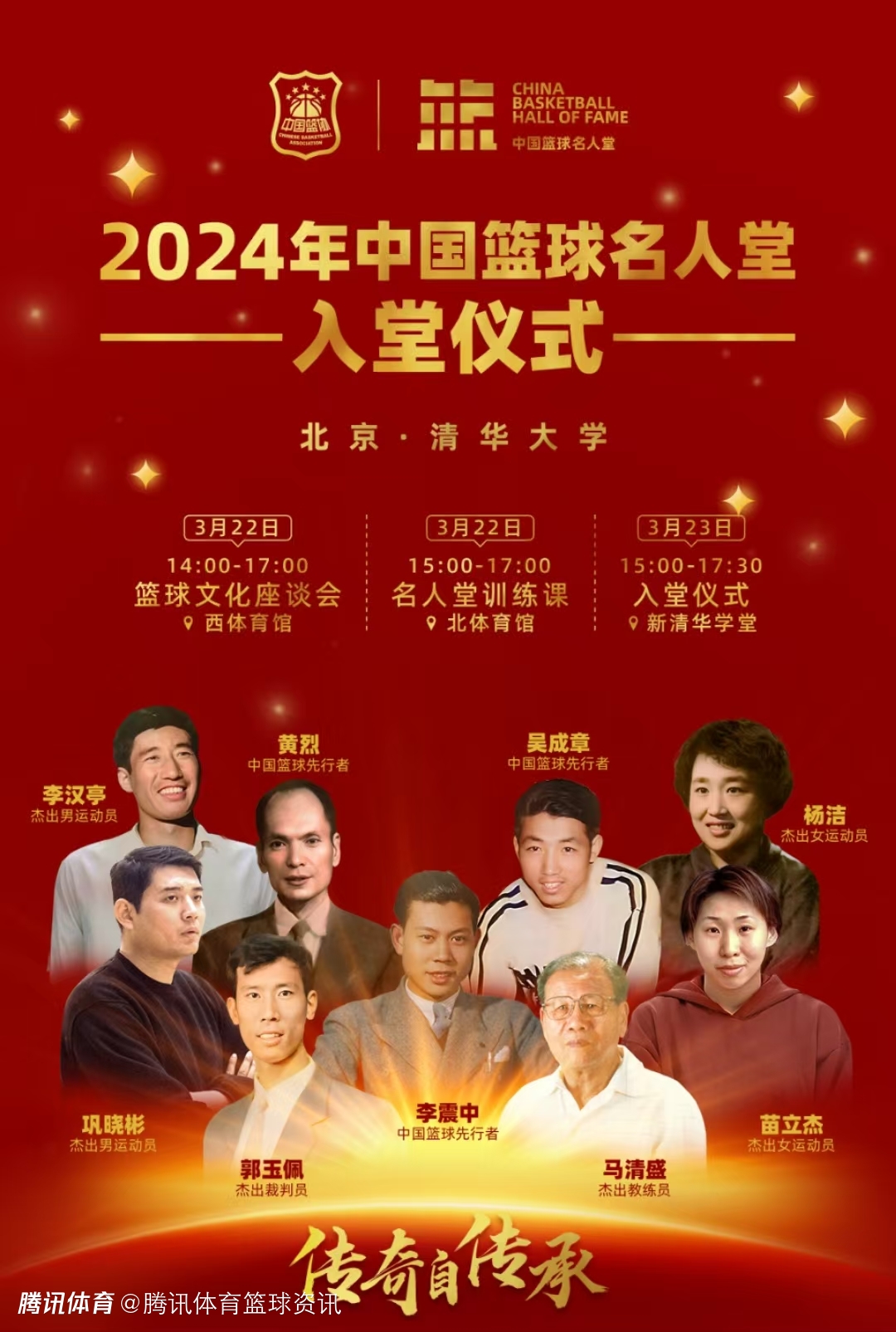 3月23日(周日)15:00-17:30,入堂仪式将在新清华学堂举行。届时将通过入堂人物演讲、主题短片、AI重现等环节,讲述中国篮球传奇故事,向为中国篮球事业作出卓越贡献的入堂人物致以最高致敬。