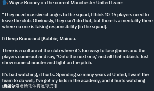 鲁尼说道:“球队阵容亟需大规模调整,我认为有10到15名球员需要离开俱乐部。显然,他们没办法一下子做到这点,但球队中存在一种不良心态,那就是阵容里没有人愿意承担责任。以目前球队现有球员情况来说,我只会留下布鲁诺-费尔南德斯和梅努。”