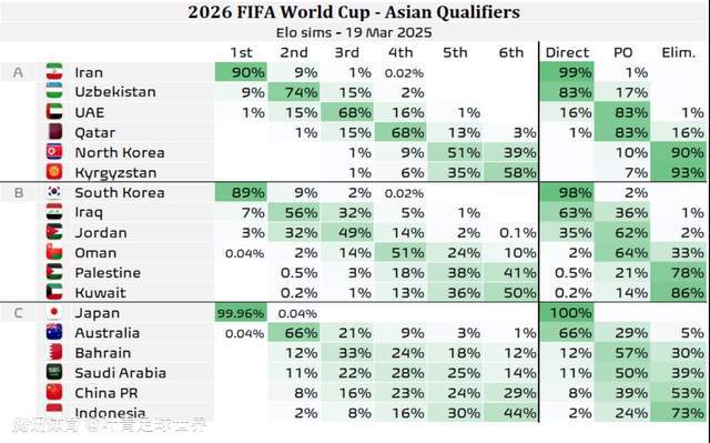 2025-03-19 21:303月20日,世预赛亚洲区18强赛全面开打。19日,著名数据平台“足球数据”更新OPTA预测的18强赛出线概率。OPTA通过10000次模拟,预测各队直通世界杯、进入第4轮、出局的概率。