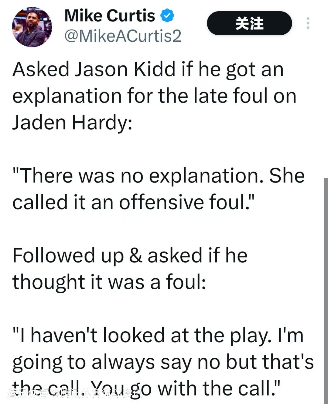 当被问及哈迪在比赛末段遭遇的那次犯规,基德是否得到裁判说明时,他回应道:“没有任何解释。裁判判定那是一次进攻犯规。”