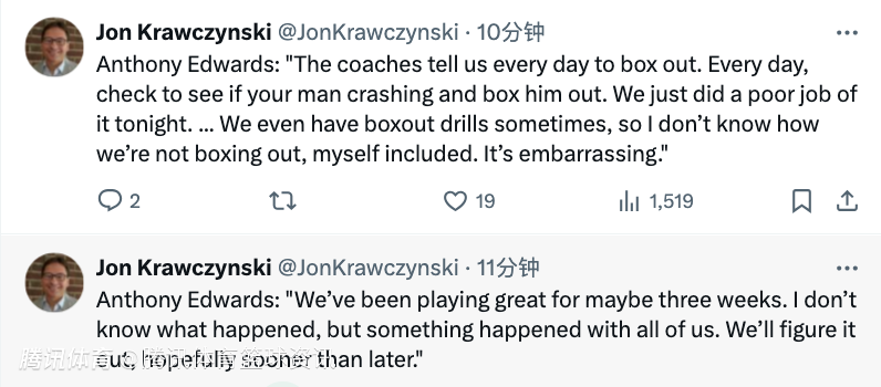 爱德华兹表示:“教练每天都叮嘱我们要卡位抢篮板,每天都提醒我们留意自己防守的球员是否冲向篮下,然后卡住他的位置,但今晚我们在这方面做得非常糟糕,我们有时甚至还会进行卡位训练,所以我不明白为什么我们没做好卡位,当然也包括我在内,这确实让人难堪。”