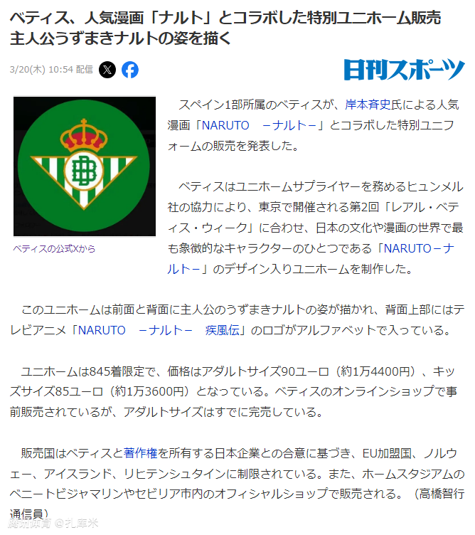 贝蒂斯推出火影版联名球衣:成人版售价90欧元,预售刚开始就售罄