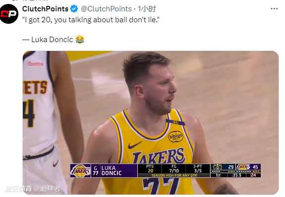 第二节,湖人攻势不减并且把领先优势领先到28分,之后湖人整体进攻出现问题,被掘金疯狂反扑,不过半场打完,湖人仍73-59领先14分;上半场,东契奇14投8中拿到25分3篮板4助攻,期间东契奇罚球时喷垃圾话:我都单节20分了,你们还在抱怨“篮球不会撒谎”。