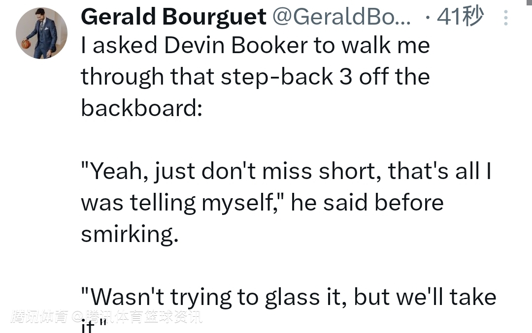 当记者让布克详细说说那个打板后撤步三分球时,他这样说道:"当时我就告诉自己,千万别投短了。"