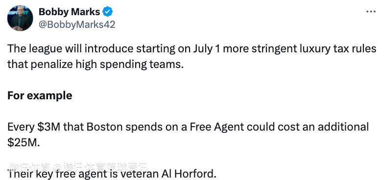 另外,联盟将从7月1日起推行更为严格的奢侈税规则,以此对高额支出的球队进行处罚,举例来说,波士顿凯尔特人队每在一名自由球员身上花费300万美元,可能就要额外付出 2500 万美元的代价,他们的关键自由球员是老将霍福德。