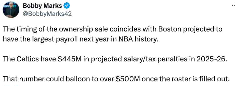 随后薪资专家Bobby Marks发推,分析了关于凯尔特人出售一事,他表示凯尔特人所有权出售的时间,恰好与球队预计在明年拥有NBA 历史上最高薪资支出的情况同步。凯尔特人队在2025-2026赛季预计的薪资及奢侈税支出高达 4.45 亿美元,一旦球队大名单确定,这一数字可能会激增至超过 5 亿美元。