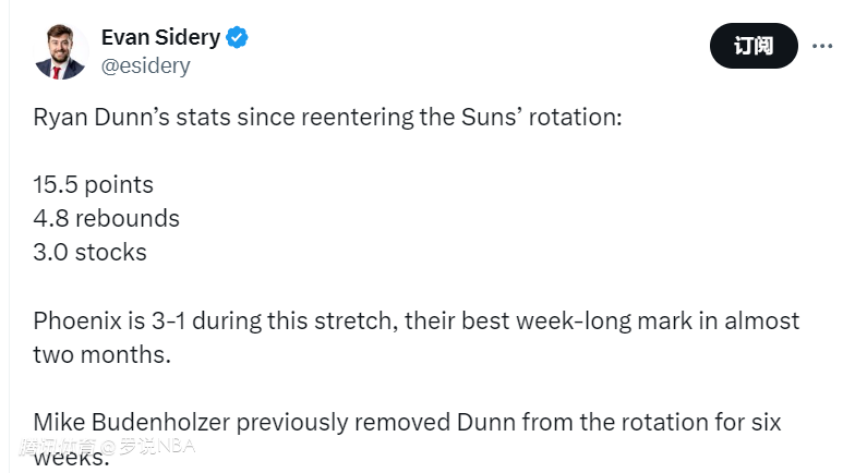 除了吐槽比尔的幅面影响,Sidery还谈到了布登霍尔泽此前对邓恩的弃用。“莱恩-邓恩重返轮换后的4场比赛,场均15.5分4.8篮板,场均抢断+盖帽的次数是3次。太阳在这4场比赛里3胜1负,这是他们近两个月以来最好的一周战绩。布登霍尔泽此前曾将邓恩从轮换阵容中剔除了六周。”