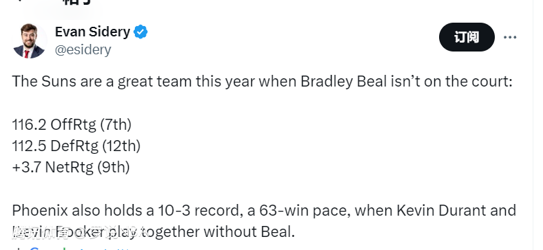 Sidery写道:“今年当布拉德利-比尔不在场上时,太阳队堪称一支出色的球队,他们的进攻效率能达到116.2(联盟第7),防守效率能达到112.5(联盟第12),净效率值是+3.7(联盟第9)。当杜兰特和布克一同上场且比尔缺阵时,太阳队战绩为10胜3负,按这胜率折算下来能取得63胜。”