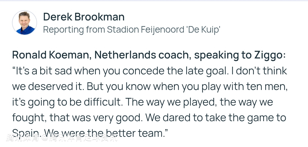 谈到本场比赛,科曼表示:“在比赛尾声阶段被对手进球,这有点令人沮丧。我认为我们不该遭遇这样的结果。但你也知道,当球队少一人作战时,比赛就会变得艰难。我们的比赛方式,我们的拼搏劲头,都非常出色。我们敢于向西班牙队发起冲击,(在场上大部分时间)我们才是表现更优的那支球队。”