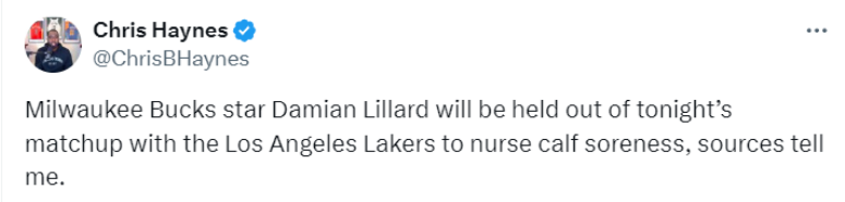 里弗斯表示,字母哥本场将会出战,但利拉德预计不会上场。名记Chris Haynes随后发文表示利拉德因小腿酸痛将缺阵。利拉德本赛季代表雄鹿出战58场比赛,场均上场36.1分钟,场均贡献24.9分4.7篮板7.1助攻1.2抢断0.2盖帽,投篮命中率44.8%,三分球命中率37.6%,罚球命中率92.1%。