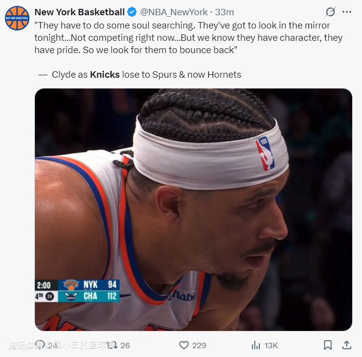 名嘴克莱德谈到尼克斯:他们应该好好反省一下了,这两场比赛需要审视自己的硬实力,现在不该去想什么竞争,要重新建立尊严与骨气,我希望他们能重振旗鼓。