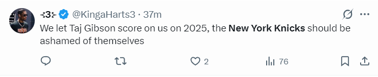 尼克斯球迷:我们竟然让泰-吉布森命中了一个球,这对于尼克斯来说是很耻辱的时刻。(39岁的吉布森,本赛季合计出战27次,他还是昔日的尼克斯名宿)