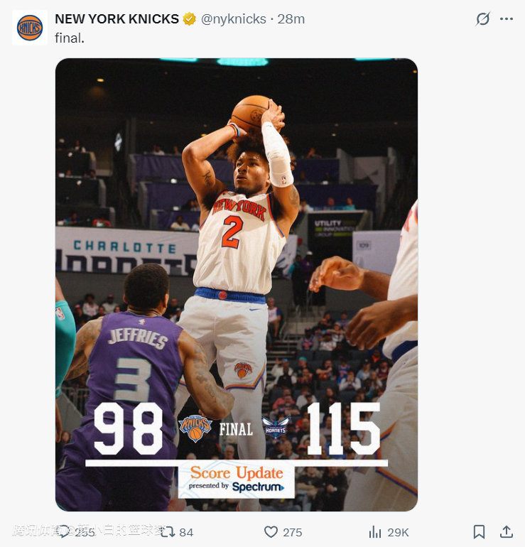 2025-03-21 10:20北京时间3月21日,纽约尼克斯98-115不敌夏洛特黄蜂吞下二连败,尼克斯这背靠背两场都输球了。这两场比赛尼克斯都是惨败,一场惨败马刺15分,一场惨败黄蜂17分,要知道黄蜂与马刺都是摆烂球队。