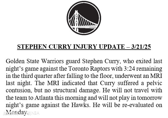 2025-03-22 05:40北京时间3月22日,金州勇士队官方宣布,队内球星斯蒂芬-库里接受了核磁共振检查,结果证实这位控球后卫骨盆挫伤,但无结构性损伤。