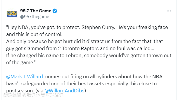 Mark Willard说道:“嘿,NBA,你们必须保护库里。他可是你们极为重要的招牌人物,而现在的情况简直失控了。仅仅是因为他受伤了,才让我们暂时不去关注这样一个事实:当时他被两名猛龙队的球员严重侵犯,却没有被吹罚犯规。要是他的名字改成勒布朗,肯定会有人被驱逐出场的。”