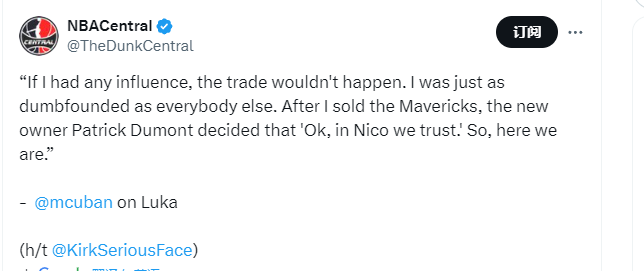 库班表示:“如果我(对球队决定)还有任何影响力的话,那笔交易就不会发生。我和其他人一样对此感到目瞪口呆。在我卖掉独行侠队之后,很多事情是由杜蒙特(现任最大股东)决定,他对哈里森和他组建的团队非常信任。所以,事情就成了现在这个样子。”