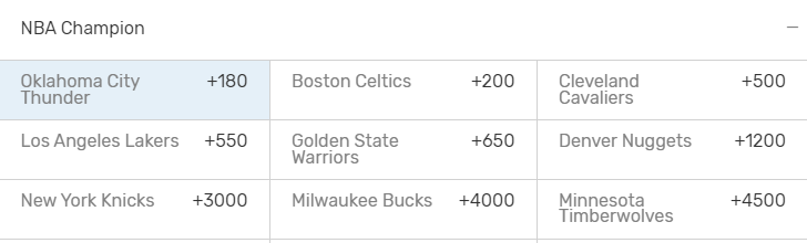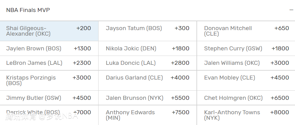 总决赛MVP的赔率一般都是和总冠军赔率相对应,因为现在雷霆是夺冠头号热门,所以他们的当家球星亚历山大成为FMVP的头号热门就不足为奇了。目前的夺冠赔率,排名第二的是凯尔特人,骑士第三,湖人第四,勇士第五,掘金第六。