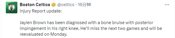 凯尔特人官方:杰伦-布朗右膝受伤缺阵两场 下周一接受重新评估