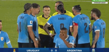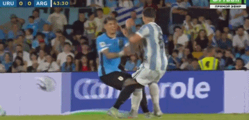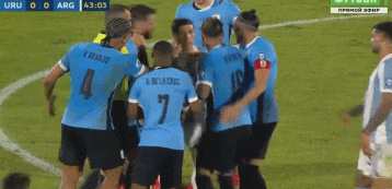比赛的第43分钟,奥利维尔、恩佐-费尔南德斯发生激烈冲突,两队至少10名球员互相推搡。5名乌拉圭球员围住恩佐试图讨要说法,随后被冲过来的麦克阿利斯特一把推开。