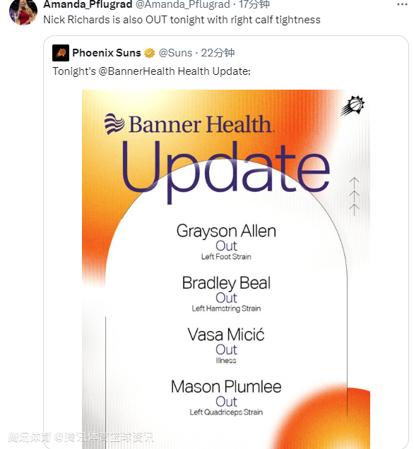 5人缺阵!太阳官方:比尔阿伦理查兹等人缺战骑士