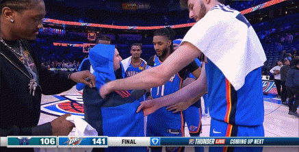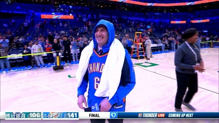 2025-03-22 11:10北京时间3月22日,NBA常规赛,雷霆坐镇主场以141-106大胜黄蜂,赛后场边发生了和谐一幕,雷霆队记尼克-加洛在采访以赛亚-乔时,被雷霆一众球员各种套衣服恶搞。