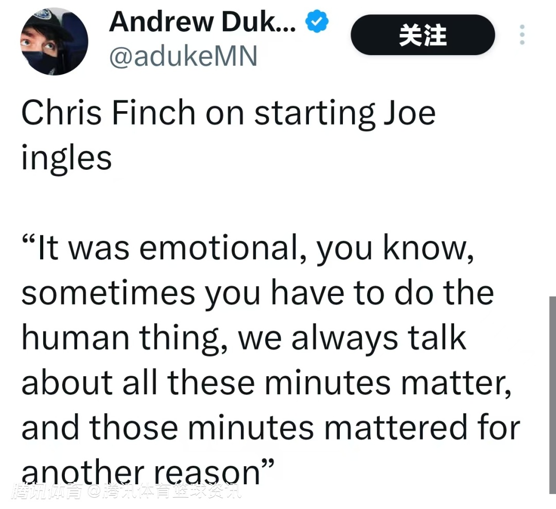 关于让英格尔斯首发的决定,芬奇表示:“这挺让人感慨的。你知道,有时候我们得有人情味一些。我们总说每一分钟都很重要,而这些上场时间因另一个原因变得意义非凡。今天有人给我出了这么个主意,要确保英格尔斯能在场上好好表现。所以我就想,如果要这么做,那就得做得漂亮些。”本场比赛为了使其自闭症儿子看到父亲打球,森林狼将英格尔斯换上首发,最终他上场6分钟得到1次助攻。