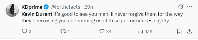 KD媒体:很高兴看到你这样出色,他们一直都在利用你,又一些手段剥夺你表现的机会,我永远不会原谅他们。