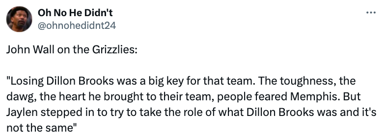 沃尔表示:“失去狄龙-布鲁克斯对那支球队而言是个重大损失,他为球队带来坚韧、斗志与勇气,曾让人们对灰熊心生忌惮,杰伦-威尔斯试图取代布鲁克斯的角色,但感觉终究不一样。”