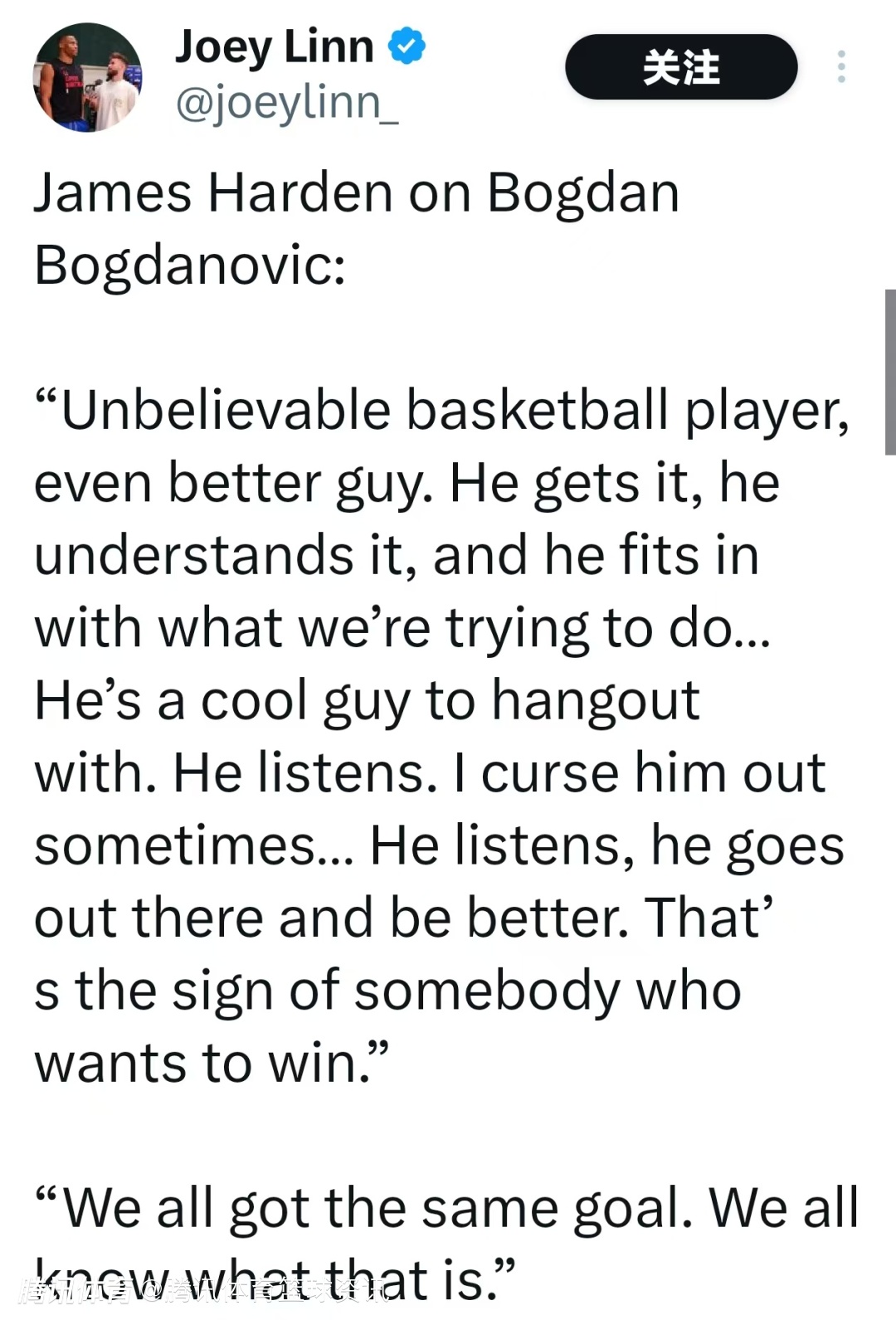 哈登谈及队友博格达诺维奇的表现时说道:“他是一位令人难以置信的篮球运动员,更是个极其出色的人。他理解比赛,懂得我们试图达成的目标,而且能融入我们正在做的事情。”