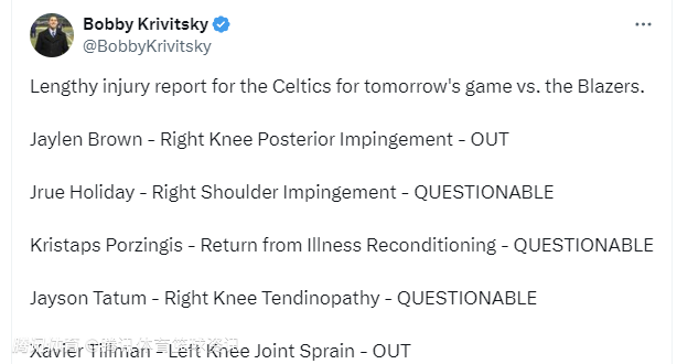 杰伦-布朗右膝后侧韧带损伤、蒂尔曼左膝关节扭伤将缺席比赛,霍乐迪右肩扭伤、波尔津吉斯生病后恢复、塔图姆膝腱鞘炎出战成疑。